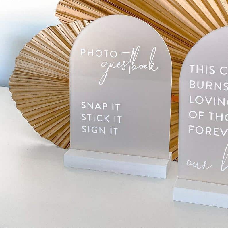 Frosted Acrylic Arch “Snap it, Shake it, Stick it.”$10.00 Frosted Acrylic Arch "Snap it, Shake it, Stick it." quantity Add to cart Add to Wishlist This product is already in your Wishlist. Browse my Wishlist Category: Signage Related products Mirrored Seating Plan Holder $35.00 Add to Wishlist This product is already in your Wishlist. Browse my Wishlist “Love” sign $10.00 Add to Wishlist This product is already in your Wishlist. Browse my Wishlist “Wish” sign $10.00 Add to Wishlist This product is already in your Wishlist. Browse my Wishlist “Mr Right, Mrs Always Right” timber sign pair $15.00 Add to Wishlist This product is already in your Wishlist. Browse my Wishlist