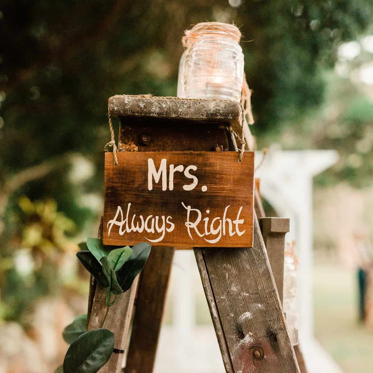 “Mr Right, Mrs Always Right” timber sign pair$15.00 "Mr Right, Mrs Always Right" timber sign pair quantity Add to cart Add to Wishlist This product is already in your Wishlist. Browse my Wishlist Category: Signage Related products “Mrs & Mrs” white table sign $10.00 Add to Wishlist This product is already in your Wishlist. Browse my Wishlist Frosted Acrylic Arch on White Frame “Welcome to our Wedding.” $75.00 Add to Wishlist This product is already in your Wishlist. Browse my Wishlist “Wedding” Arrow – in white or chocolate $10.00 Add to Wishlist This product is already in your Wishlist. Browse my Wishlist Mirrored Seating Plan Holder $35.00 Add to Wishlist This product is already in your Wishlist. Browse my Wishlist