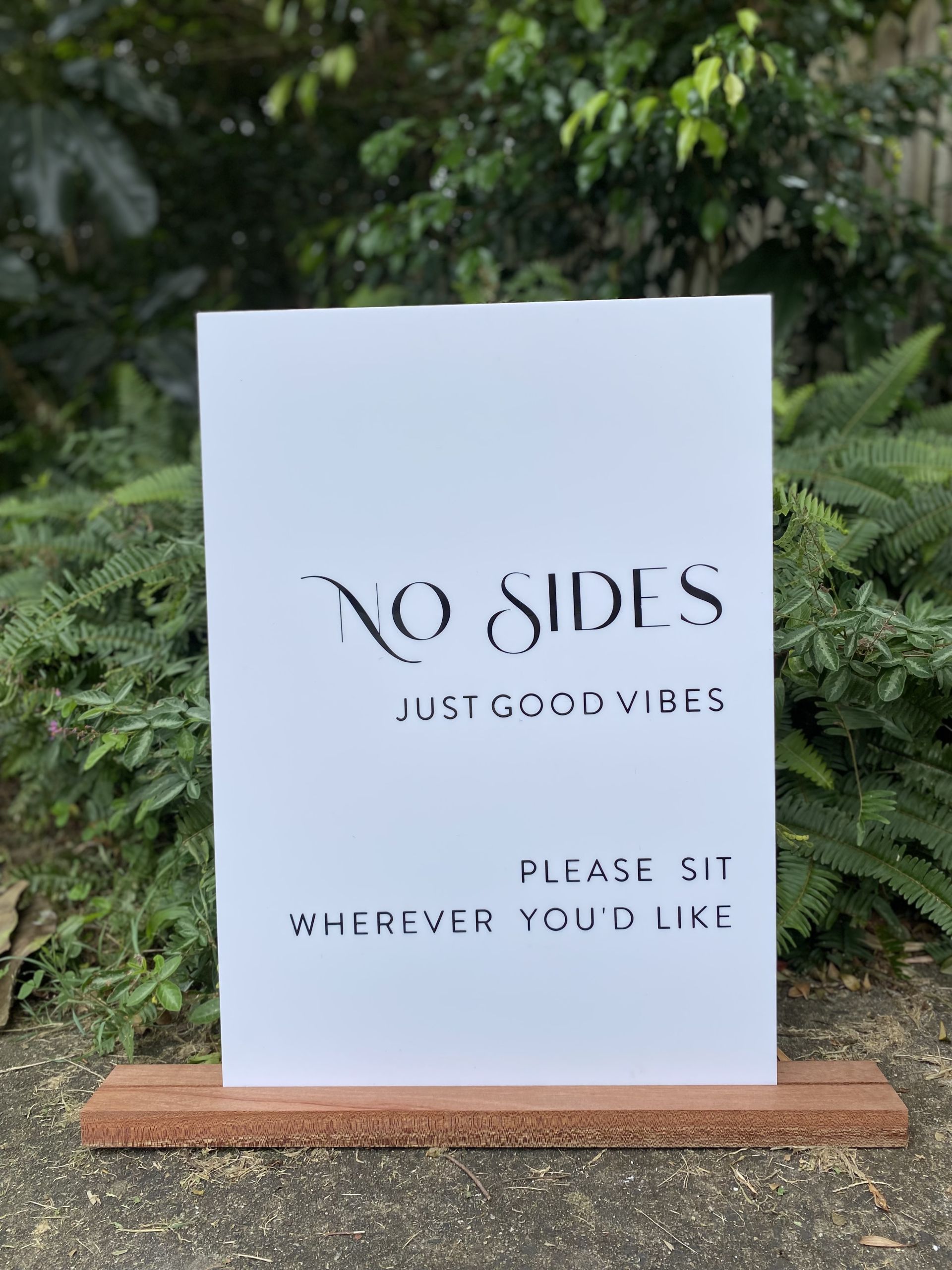 No Sides Ceremony Sign$35.00 No Sides Ceremony Sign quantity Add to cart Add to Wishlist This product is already in your Wishlist. Browse my Wishlist Category: Signage Description Description Ceremony Seating Sign “No Sides, Just Good Vibes. Please sit wherever you’d like” With wooden base Related products “Mrs & Mrs” white table sign $10.00 Add to Wishlist This product is already in your Wishlist. Browse my Wishlist A-Frame Chalkboard – mini. In white or chocolate $10.00 Add to Wishlist This product is already in your Wishlist. Browse my Wishlist “Mr & Mr” white table sign $10.00 Add to Wishlist This product is already in your Wishlist. Browse my Wishlist Unplugged Ceremony Sign $35.00 Add to Wishlist This product is already in your Wishlist. Browse my Wishlist