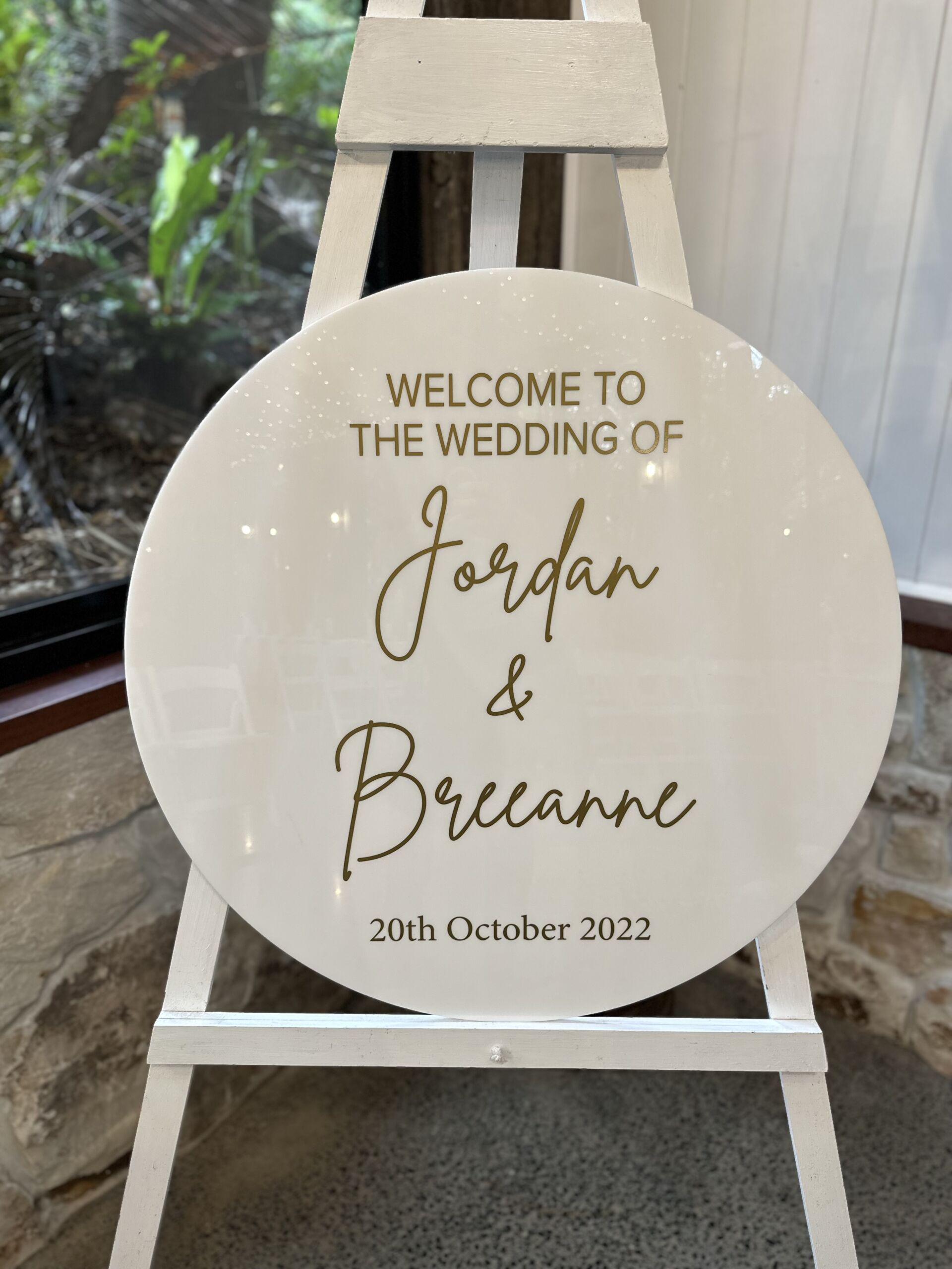 Round White & Gold Welcome Sign, personalised with names & date$125.00 Round White & Gold Welcome Sign, personalised with names & date quantity Add to cart Add to Wishlist This product is already in your Wishlist. Browse my Wishlist Category: Signage Related products Frosted Acrylic Arch on White Frame “Welcome to our Wedding.” $75.00 Add to Wishlist This product is already in your Wishlist. Browse my Wishlist Frosted Acrylic Arch “Please sign our guest book.” $10.00 Add to Wishlist This product is already in your Wishlist. Browse my Wishlist Timber Easel $15.00 Add to Wishlist This product is already in your Wishlist. Browse my Wishlist Frosted Acrylic Arch “Thank you for sharing our special day.” $10.00 Add to Wishlist This product is already in your Wishlist. Browse my Wishlist