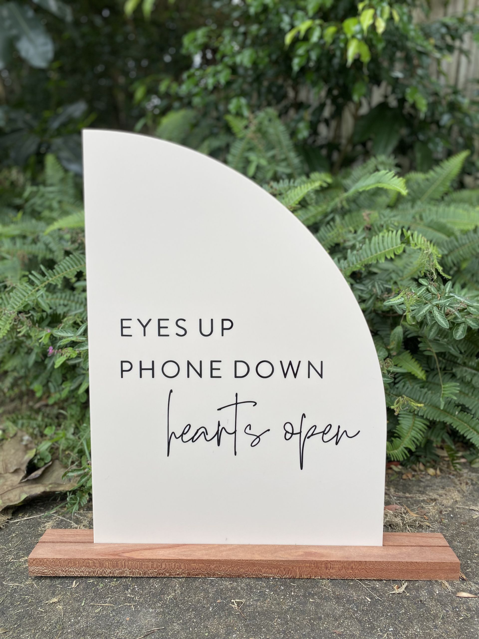 Unplugged Ceremony Sign$35.00 Unplugged Ceremony Sign quantity Add to cart Add to Wishlist This product is already in your Wishlist. Browse my Wishlist Category: Signage Description Description Unplugged Sign “Eyes Up Phone Down Hearts Open” With wooden base Related products “Love” sign $10.00 Add to Wishlist This product is already in your Wishlist. Browse my Wishlist “Wedding” Arrow – in white or chocolate $10.00 Add to Wishlist This product is already in your Wishlist. Browse my Wishlist Round White Welcome Sign, personalised with names & date $125.00 Add to Wishlist This product is already in your Wishlist. Browse my Wishlist A-Frame Chalkboard – mini. In white or chocolate $10.00 Add to Wishlist This product is already in your Wishlist. Browse my Wishlist
